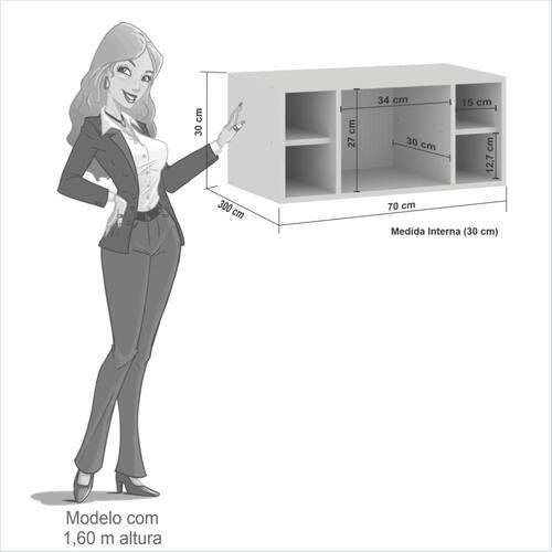 Com 70 cm de largura, 30 cm de profundidade e 30 cm de altura, acomoda bem garrafas, potes ou itens de uso frequente sem comprometer a circulação.