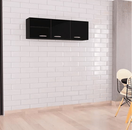 O acabamento UV em preto brilhante, com puxadores metálicos visíveis na imagem, reforça o visual contemporâneo e elegante, ideal para composições modernas.