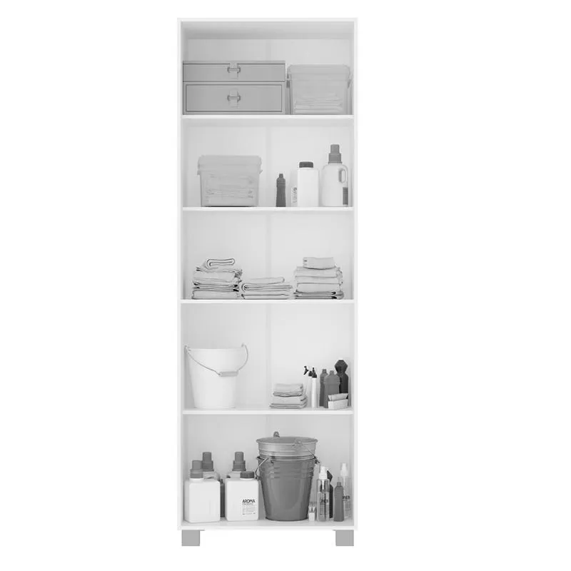 A configuração interna reúne quatro prateleiras bem distribuídas e espaçosas, ideais para organizar produtos de limpeza, documentos, utensílios ou objetos pessoais de forma prática e acessível.