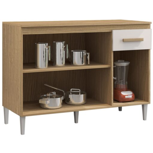 O acabamento em verniz texturizado destaca o contraste entre o tom amadeirado e as portas escuras, complementado por puxadores de madeira e pés metálicos, que reforçam o estilo contemporâneo percebido na imagem.
