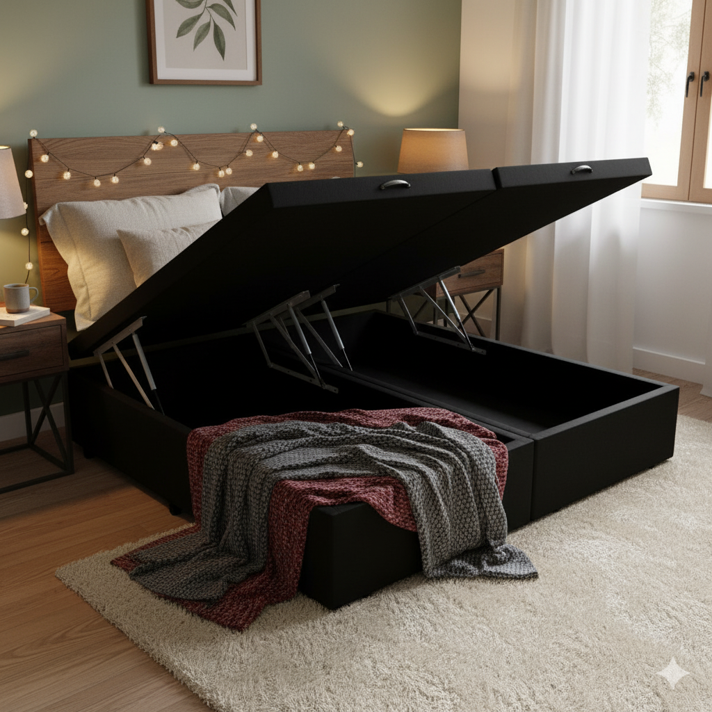 A Base Baú Casal bipartida entrega armazenamento amplo com abertura leve e segura, ideal para otimizar o espaço do quarto.