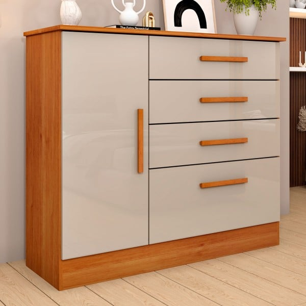 Para um quarto contemporâneo, esta cômoda MDP Chicago 1.05 entrega organização prática, visual elegante e fácil integração com diferentes composições, combinando frentes Off White semi-brilho e estrutura amadeirada, como visto na imagem.