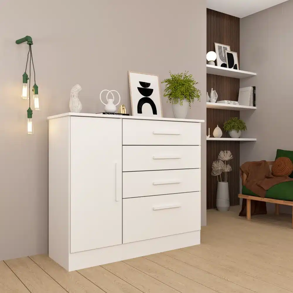As quatro gavetas utilizam corrediças metálicas telescópicas, garantindo abertura suave e acesso total ao conteúdo. A porta lateral em MDP de 15 mm funciona com dobradiças metálicas, revelando uma prateleira interna para itens maiores.