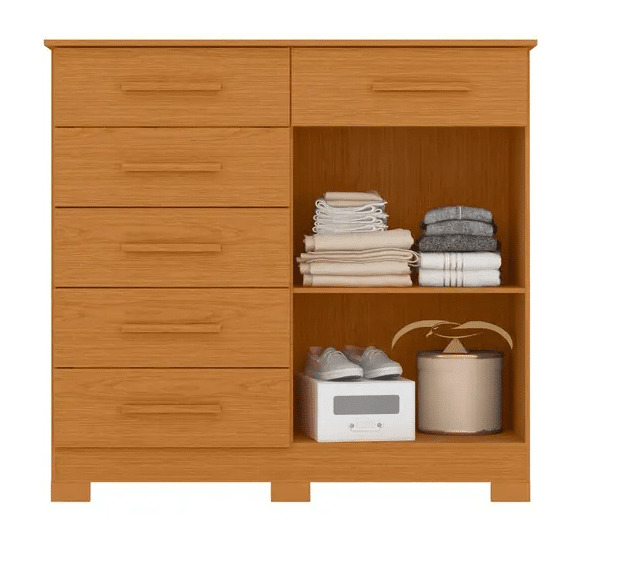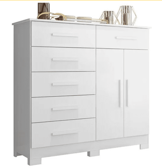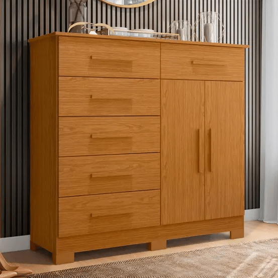 Para um quarto contemporâneo, a cômoda MDP Xangai 1.24 entrega excelente capacidade de organização, reunindo seis gavetas e duas portas para acomodar roupas, acessórios e objetos do dia a dia com praticidade.