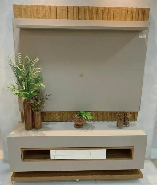 A estrutura combina nicho aberto para eletrônicos e ampla superfície para objetos decorativos, ampliando as possibilidades de uso.