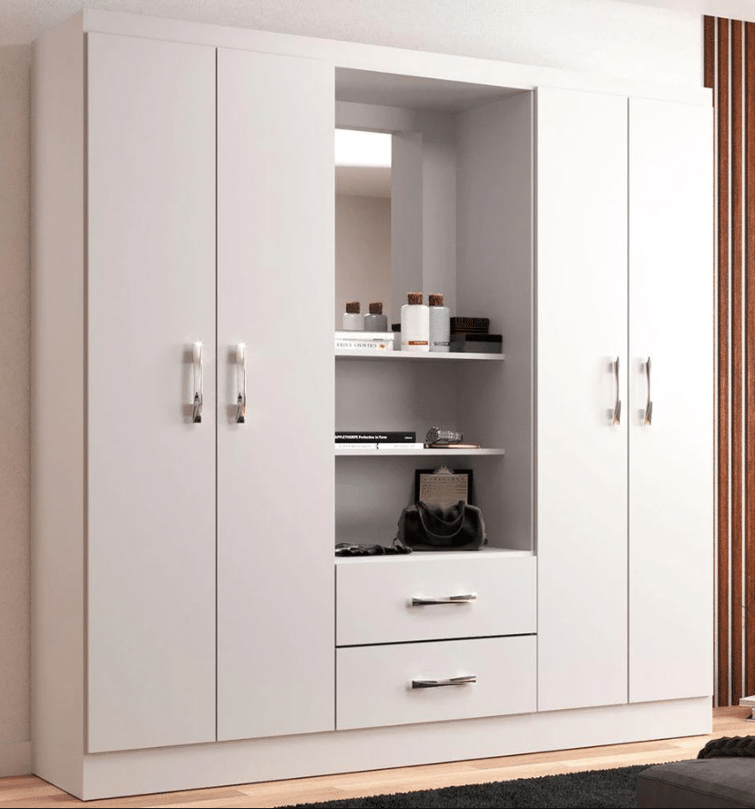As portas de bater garantem acesso fácil ao interior, enquanto o espelho central ajuda no dia a dia e amplia a sensação de espaço.