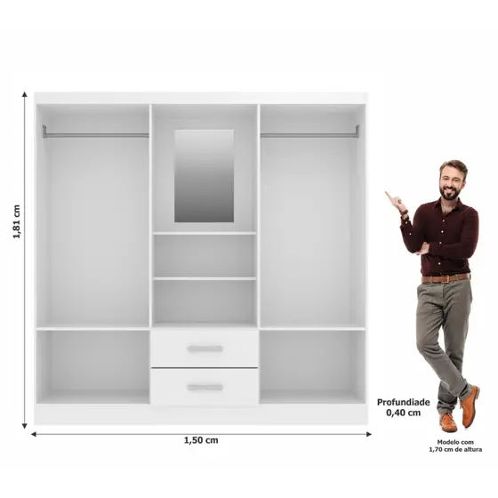 Com 181 cm de altura, 150 cm de largura e 40 cm de profundidade, ele aproveita muito bem quartos compactos, oferecendo capacidade sem pesar no ambiente.