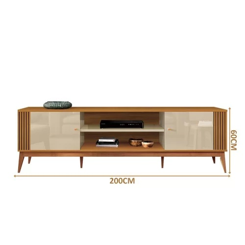 Com 200 cm de largura, 42 cm de profundidade e 60 cm de altura, acomoda eletrônicos, acessórios e objetos decorativos mantendo a área de uso prática e equilibrada.