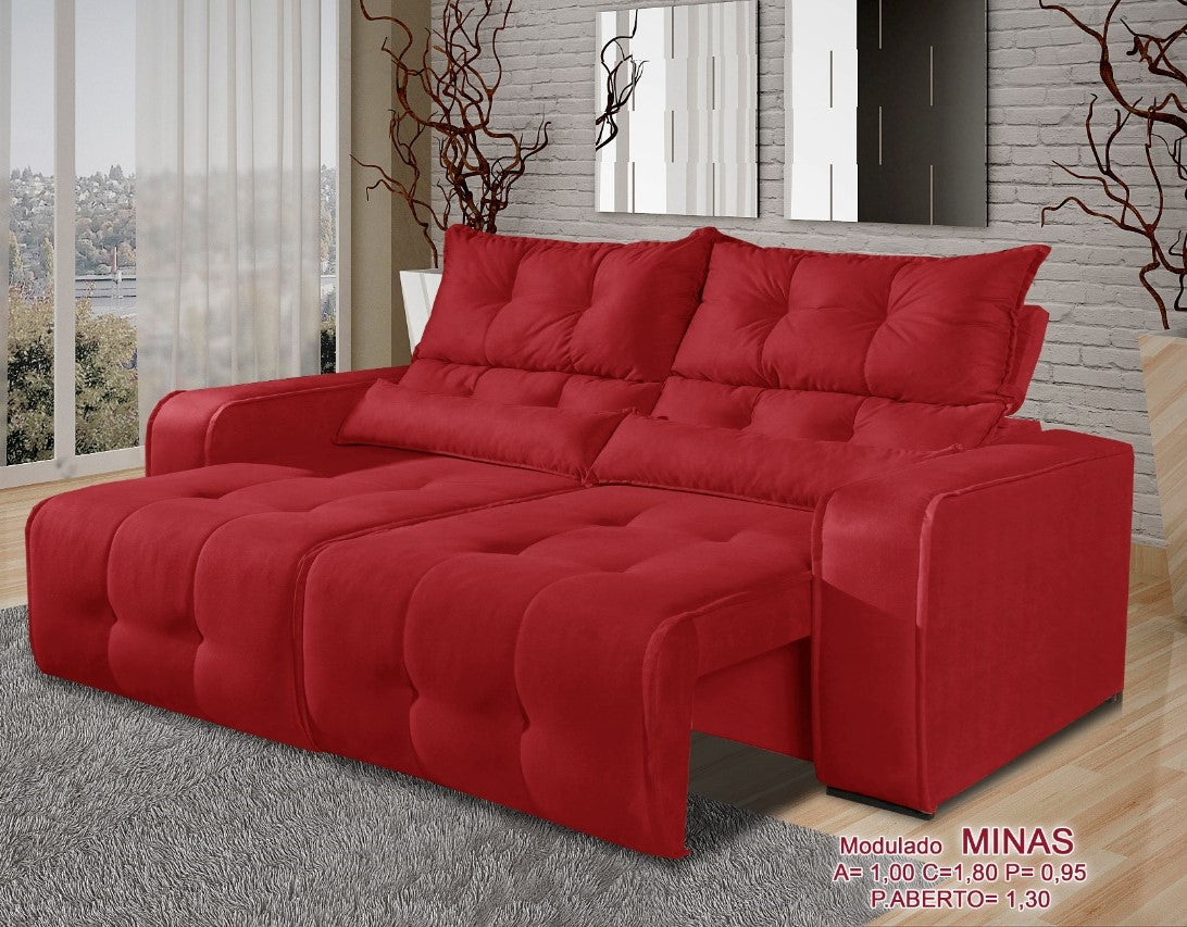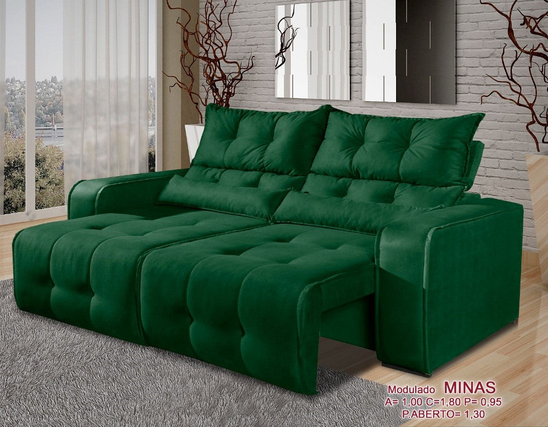 Com 180 cm de largura, 95 cm de profundidade e 100 cm de altura, atinge 130 cm de profundidade quando aberto, ampliando o espaço para descanso e conforto total.